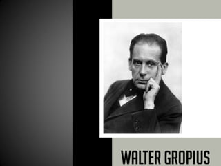 A Bauhaus foi fundada por Walter Gropius na Alemanha e integrou artes aplicadas e belas-artes, valorizando o design industrial. Desenvolveu artes decorativas, música, arquitetura e teatro com trabalho em equipe entre professores, mestres, operários e artistas. Seu edifício em Dessau de 1925-1927 projetado por Gropius representou atualização tecnológica e normalização do design industrial.