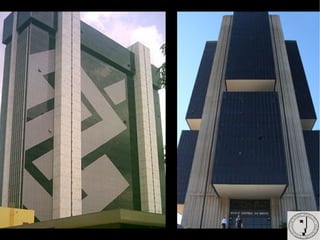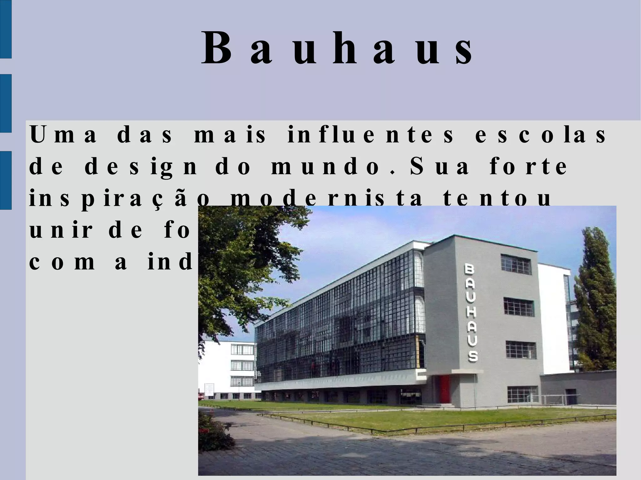 A Bauhaus foi uma escola de arte, design e arquitetura fundada na Alemanha em 1919 que teve grande influência no modernismo. Seus métodos revolucionários buscavam unir arte e indústria, e professores como Kandinsky, Klee e Gropius moldaram o design do século 20 com obras como a cadeira Wassily. A Bauhaus teve grande impacto no Brasil através de ex-alunos como Max Bill e Oscar Niemeyer, que projetaram Brasília segundo seus princípios funcionais.