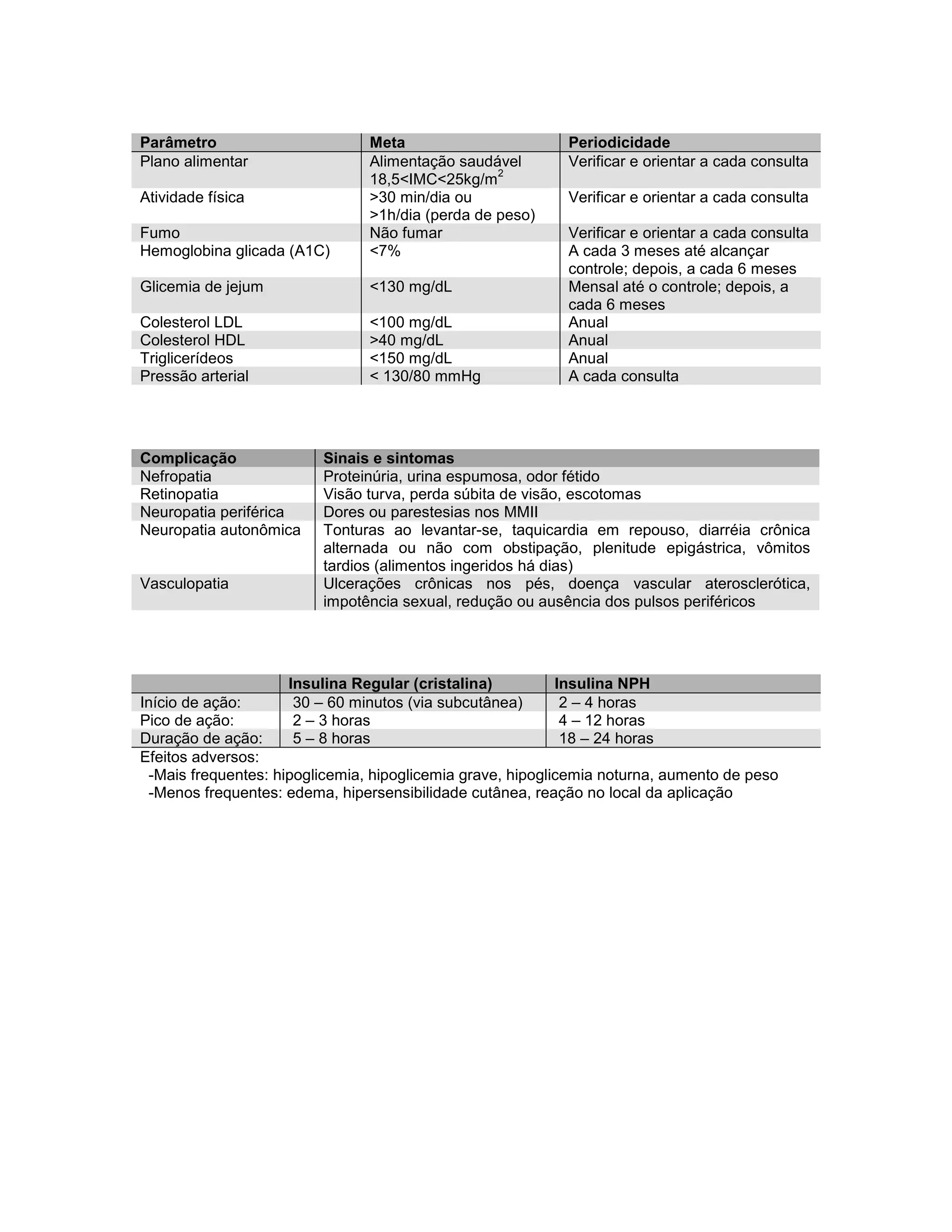 Este documento fornece diretrizes para o monitoramento e tratamento de pacientes diabéticos, incluindo parâmetros como IMC, atividade física, hemoglobina glicada, glicemia, colesterol e pressão arterial que devem ser verificados em diferentes periodicidades, assim como sinais de complicações e informações sobre insulina regular e NPH.