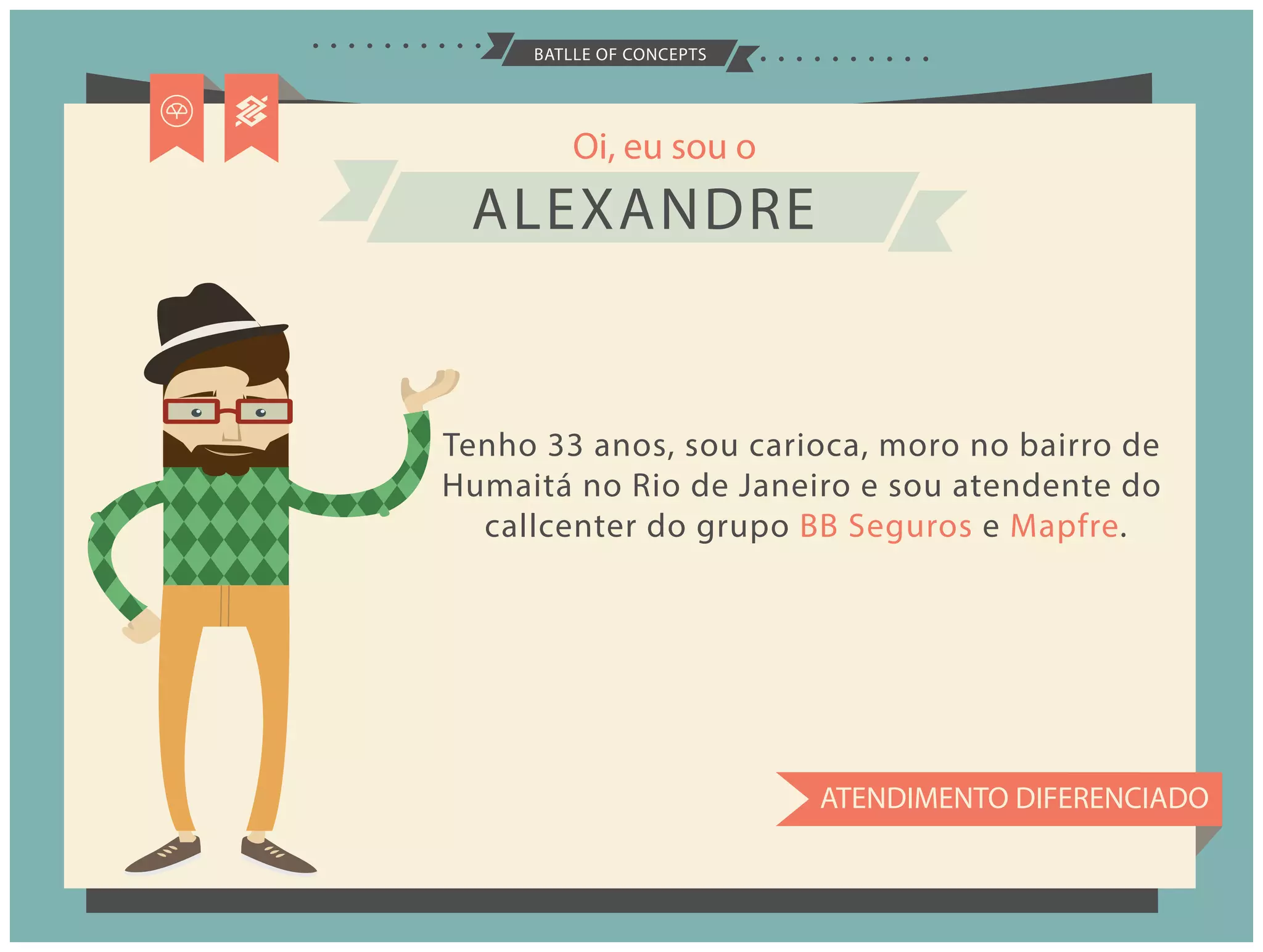 Este documento apresenta Alexandre, um atendente de 33 anos de uma seguradora que busca fornecer um atendimento personalizado e eficaz aos clientes. Ele explica que o objetivo é resolver os problemas dos clientes e fazê-los desligar o telefone mais calmos do que quando ligaram. O documento também descreve como Alexandre pretende se relacionar com os clientes de forma próxima e criativa, identificando-se com seus problemas, para fornecer soluções humanas.