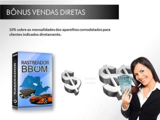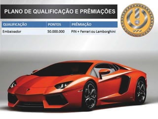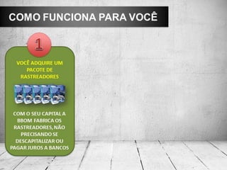 O documento apresenta uma oferta de pacotes de produtos com diferentes quantidades de unidades e prazos de pagamento. Também mostra os ganhos de duas pessoas em uma semana com bônus de início rápido, equipe e comodato que totalizaram R$1.500,00. Por fim, anuncia uma viagem de executivos em setembro na Costa Brasileira.