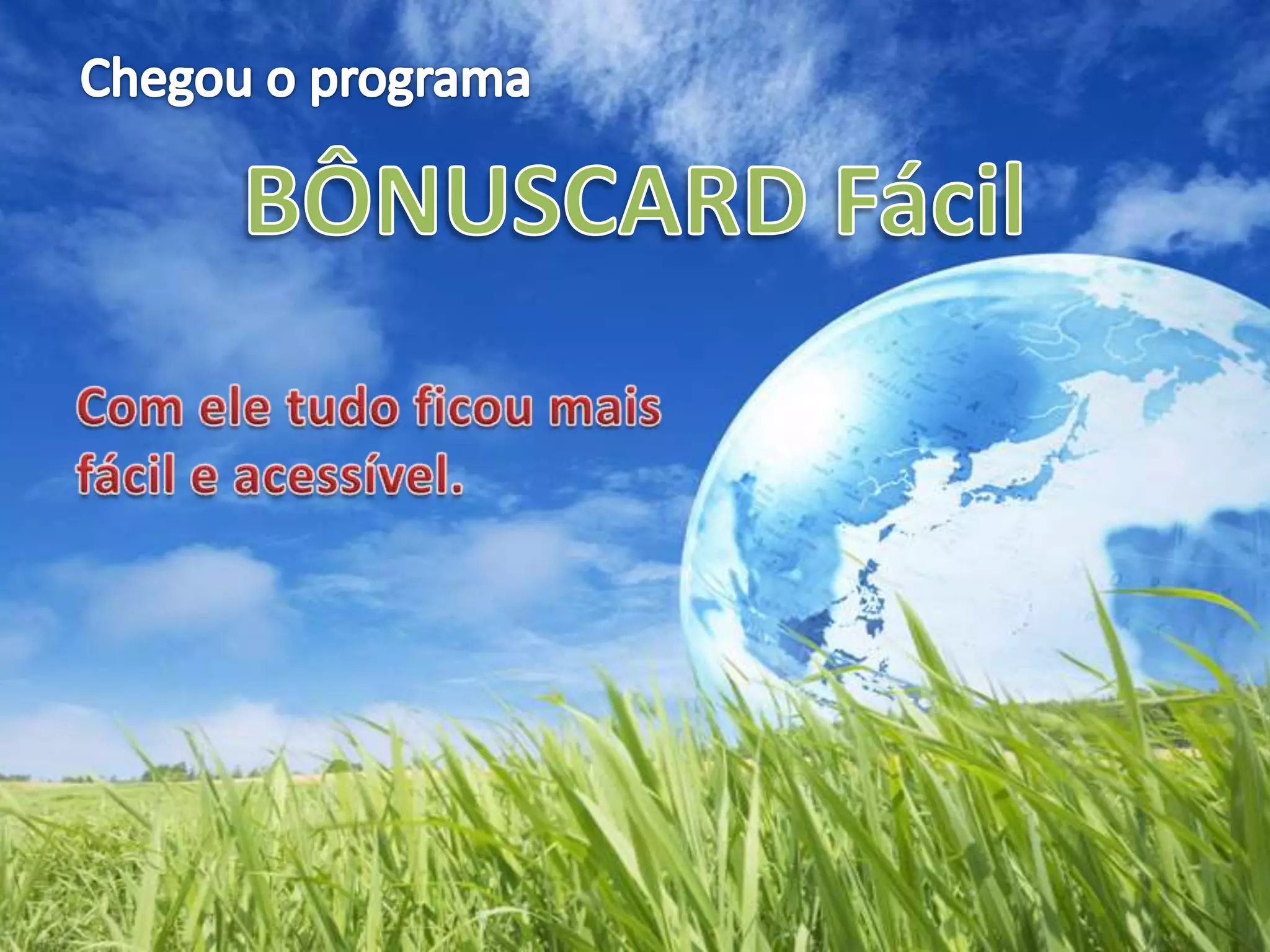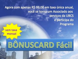 O documento descreve o programa BÔNUSCARD Fácil, que oferece serviços como carteira digital, renda extra, rede de convênios e inclusão digital por uma taxa anual de R$99. Ao se cadastrar, o associado recebe cartões, manual e orientações para divulgar o programa e conquistar novos associados, gerando bônus com a expansão da rede.