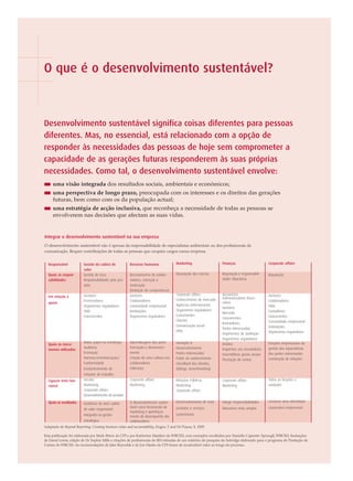 O documento discute como os profissionais de marketing podem integrar o desenvolvimento sustentável em suas estratégias para criar vantagens competitivas através da inovação de marca, desenvolver a confiança dos clientes e identificar novas oportunidades de mercado. Ele fornece exemplos de como algumas empresas usaram atributos sociais e ambientais para diferenciar suas marcas e destaca questões que os profissionais de marketing devem considerar ao refletir sobre como integrar o desenvolvimento sustentável em suas estratégias.