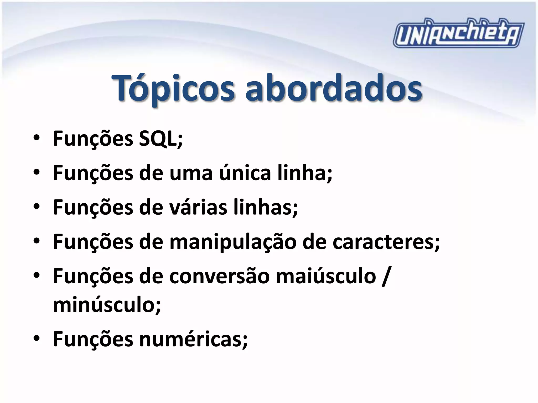 O documento discute funções SQL, incluindo funções de uma única linha para manipulação de caracteres, números e datas, e funções de várias linhas. Também aborda conversão de tipos de dados explícita e implícita.