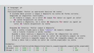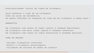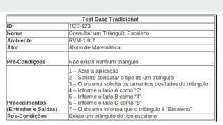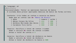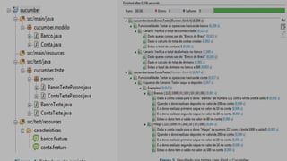 O documento discute Behavior Driven Development (BDD) e como o framework Cucumber pode ser usado com Java e Selenium para implementar BDD. Ele explica os princípios do BDD, a diferença entre critérios de aceitação e casos de teste, como o Cucumber usa arquivos Gherkin para descrever funcionalidades em linguagem natural, e dá um exemplo prático de como usar o framework.