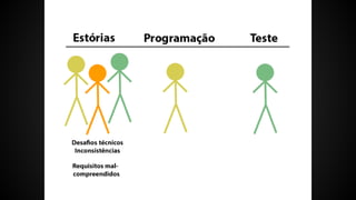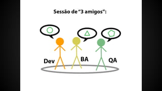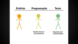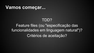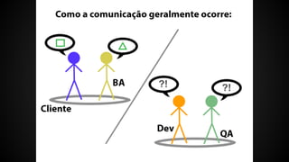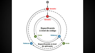 O documento discute as técnicas de Test Driven Development (TDD) e Behavior Driven Development (BDD), comparando-as e explicando como o BDD evoluiu do TDD. Ele fornece exemplos de como especificar funcionalidades usando BDD e enfatiza a importância de exemplos concretos para compreender claramente um domínio.