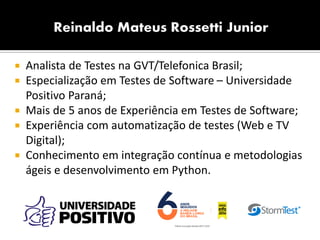 O documento discute a abordagem para testes de regressão automatizados para TV digital utilizando Python e o framework S3-Storm. Apresenta as vantagens da automação para lidar com constantes mudanças, reduzir custos e aumentar a cobertura de testes. Também descreve as funcionalidades do S3-Storm para teste em diferentes dispositivos e a importância de se estruturar os scripts de forma limpa, robusta e flexível.