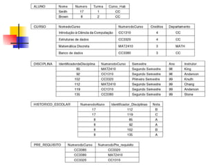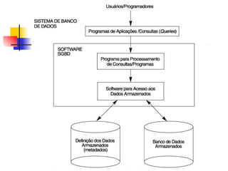 O documento discute conceitos básicos sobre bancos de dados, incluindo sua definição, evolução e importância. Também aborda os principais componentes de um sistema de gerenciamento de banco de dados como modelo de dados, linguagens e gerenciamento de transações.