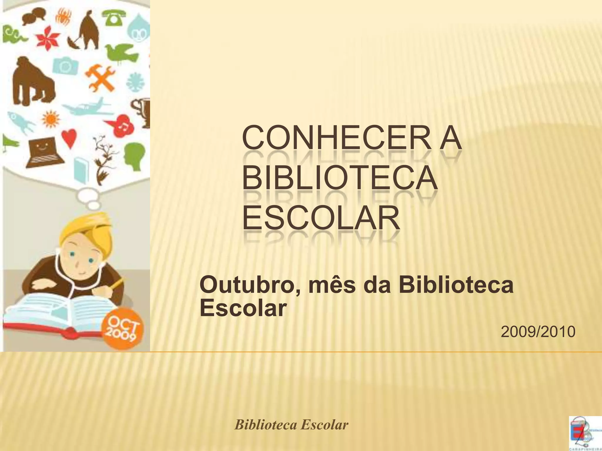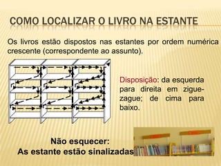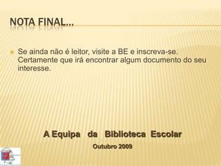 O documento descreve os recursos e serviços da Biblioteca Escolar, incluindo suas zonas, organização do acervo usando a Classificação Decimal Universal, e métodos de pesquisa no catálogo online. Explica como localizar materiais físicos usando as cotas e como interpretar as cotas para encontrar os itens nas prateleiras. Encoraja os leitores a visitarem a biblioteca e se inscreverem.