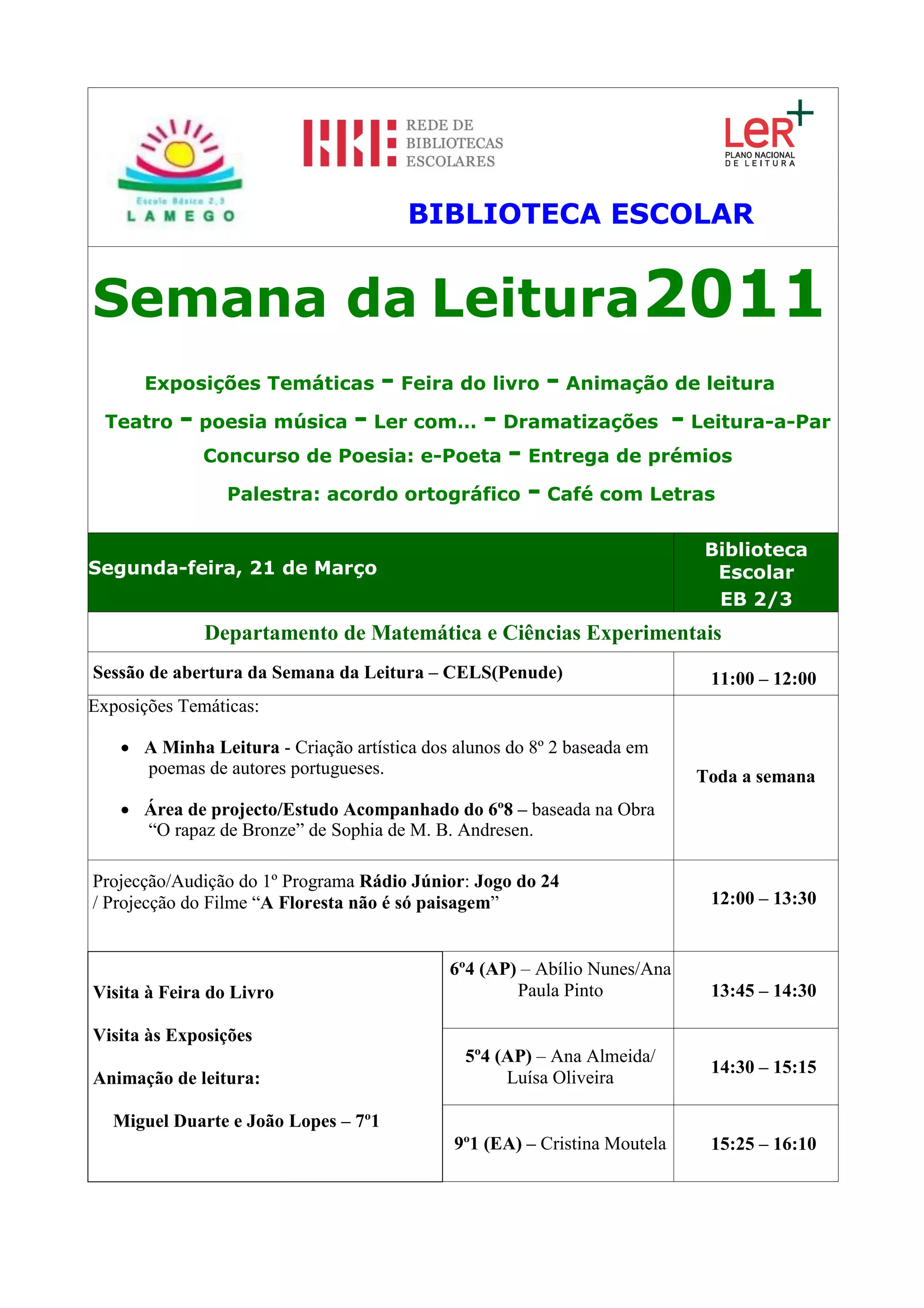 O documento descreve a programação da Semana da Leitura numa escola básica, incluindo exposições temáticas, visitas à feira do livro, dramatizações, animação de leitura, projetos de rádio, projeções de filmes, palestras e um concurso de poesia.