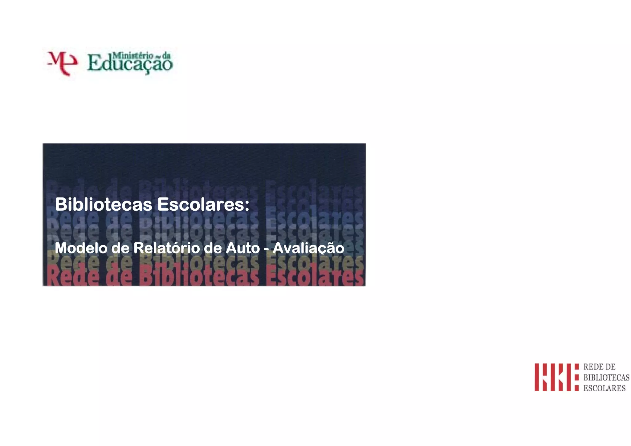 Este documento fornece um modelo de relatório de autoavaliação para bibliotecas escolares. Ele inclui seções sobre avaliação do apoio ao desenvolvimento curricular, promoção da literacia da informação, leitura e literacia, projetos, parcerias e atividades livres e abertura à comunidade, e gestão da biblioteca escolar. O relatório destina-se a descrever os resultados da autoavaliação e orientar o planejamento de ações futuras.