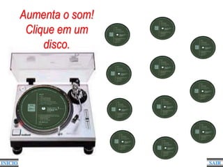 O documento instrui o leitor a aumentar o som e clicar em um disco, enquanto fornece botões para iniciar e sair repetidamente.