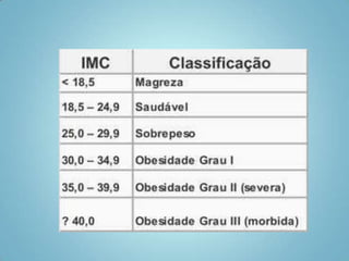 Este documento discute obesidade e subnutrição. A obesidade ocorre quando se ingere mais energia do que se gasta, levando ao excesso de gordura corporal. Isso pode causar diabetes, doenças cardíacas e problemas respiratórios. A subnutrição ocorre quando faltam nutrientes essenciais e afeta principalmente crianças em países pobres, levando a problemas de crescimento e saúde. Uma alimentação equilibrada é essencial para evitar esses problemas.