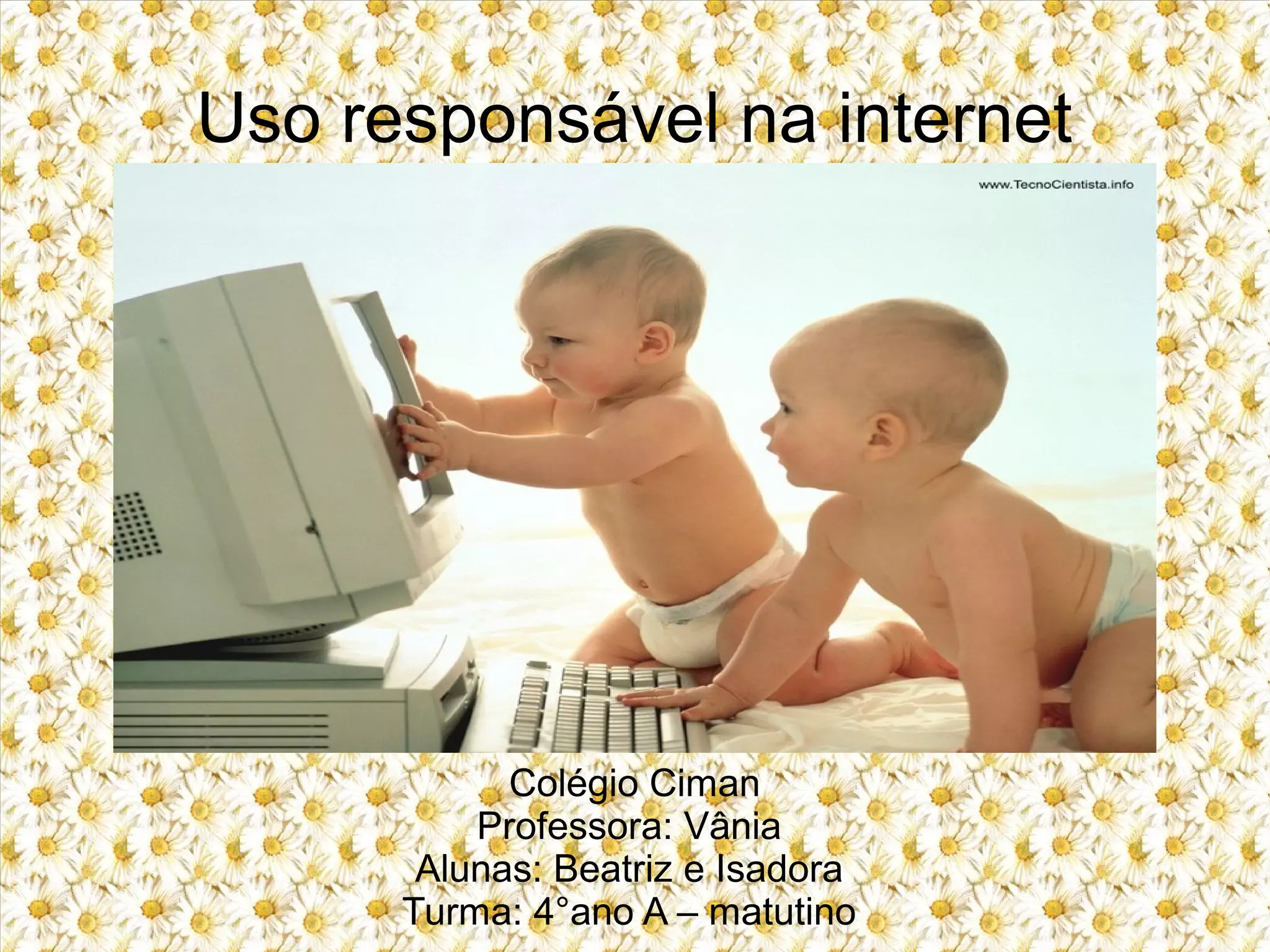 O documento é uma aula sobre uso responsável da internet para alunos de 4o ano. A professora Vânia ensina as alunas Beatriz e Isadora sobre quais sites e atividades são apropriadas para sua idade na internet, como pesquisas educativas e jogos, e o que devem evitar, como conversar com estranhos ou visitar sites inadequados.