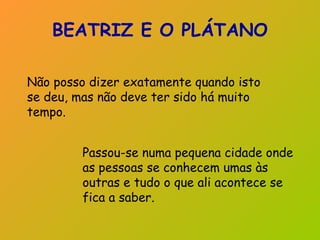 A história conta a luta de Beatriz para salvar um grande plátano centenário que ficava em frente aos correios da sua cidade. Quando as autoridades decidiram cortar o plátano por ficar mal no local, Beatriz escreveu uma carta de protesto que não foi levada em conta. Para impedir o corte, Beatriz passou a noite junto ao plátano. Isso comoveu as autoridades, que desistiram de cortar o plátano diante do amor da menina pela árvore.