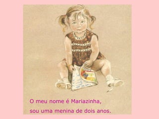 Este documento conta a história do nascimento de Mariazinha, desde quando seus pais decidiram ter um bebê até seu retorno para casa com sua mãe e pai após alguns dias na maternidade. Describe como Mariazinha crescia no ventre de sua mãe através das estações e como seus pais imaginavam se ela seria um menino ou menina.