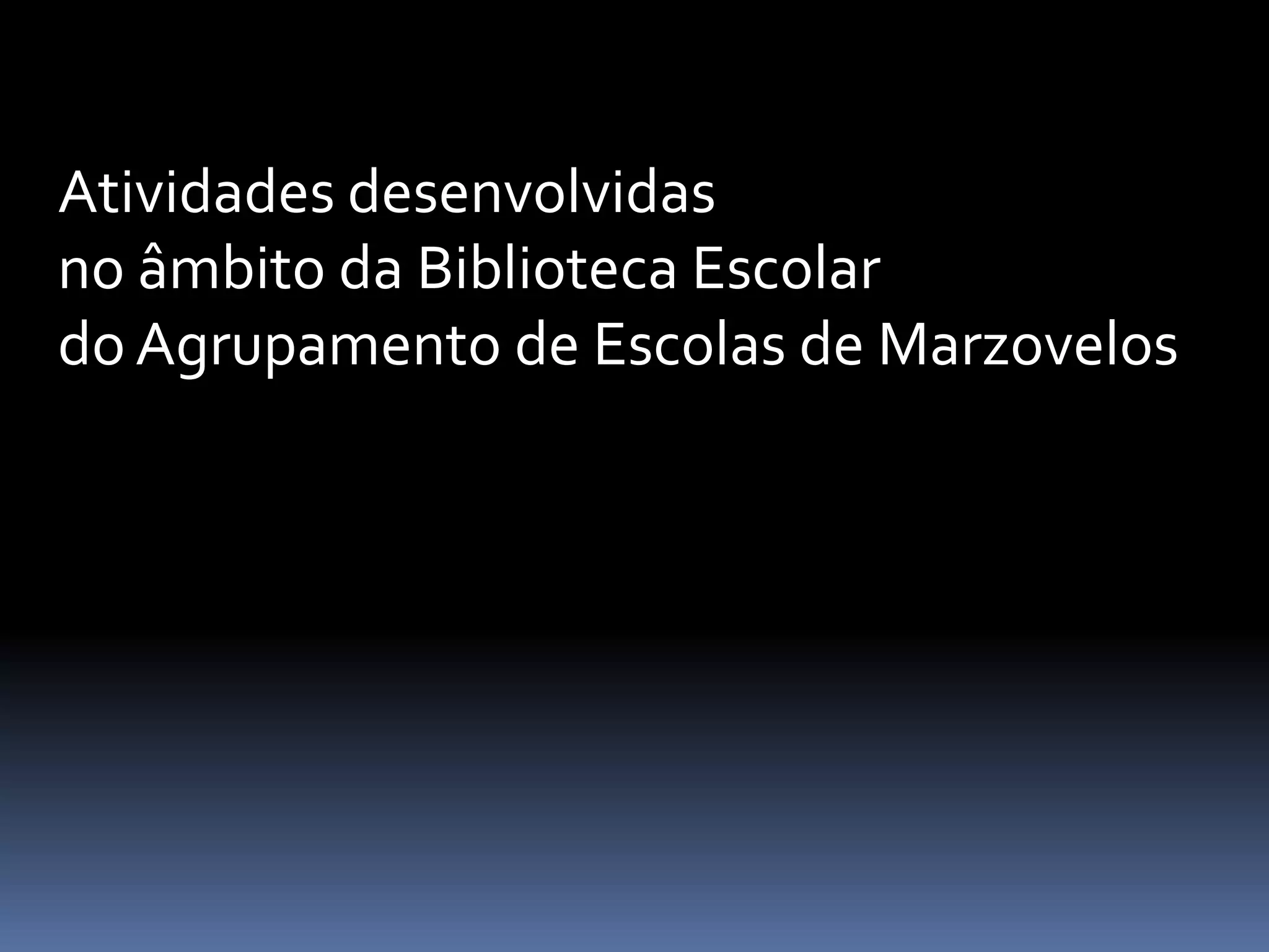O documento descreve várias atividades realizadas pela Biblioteca Escolar do Agrupamento de Escolas de Marzovelos, incluindo uma visita à Biblioteca Municipal, a participação na Feira do Livro Municipal de 2012 e uma sessão para Encarregados de Educação na escola sede com uma dramatização por alunos do 6o ano e entrega de prémios.
