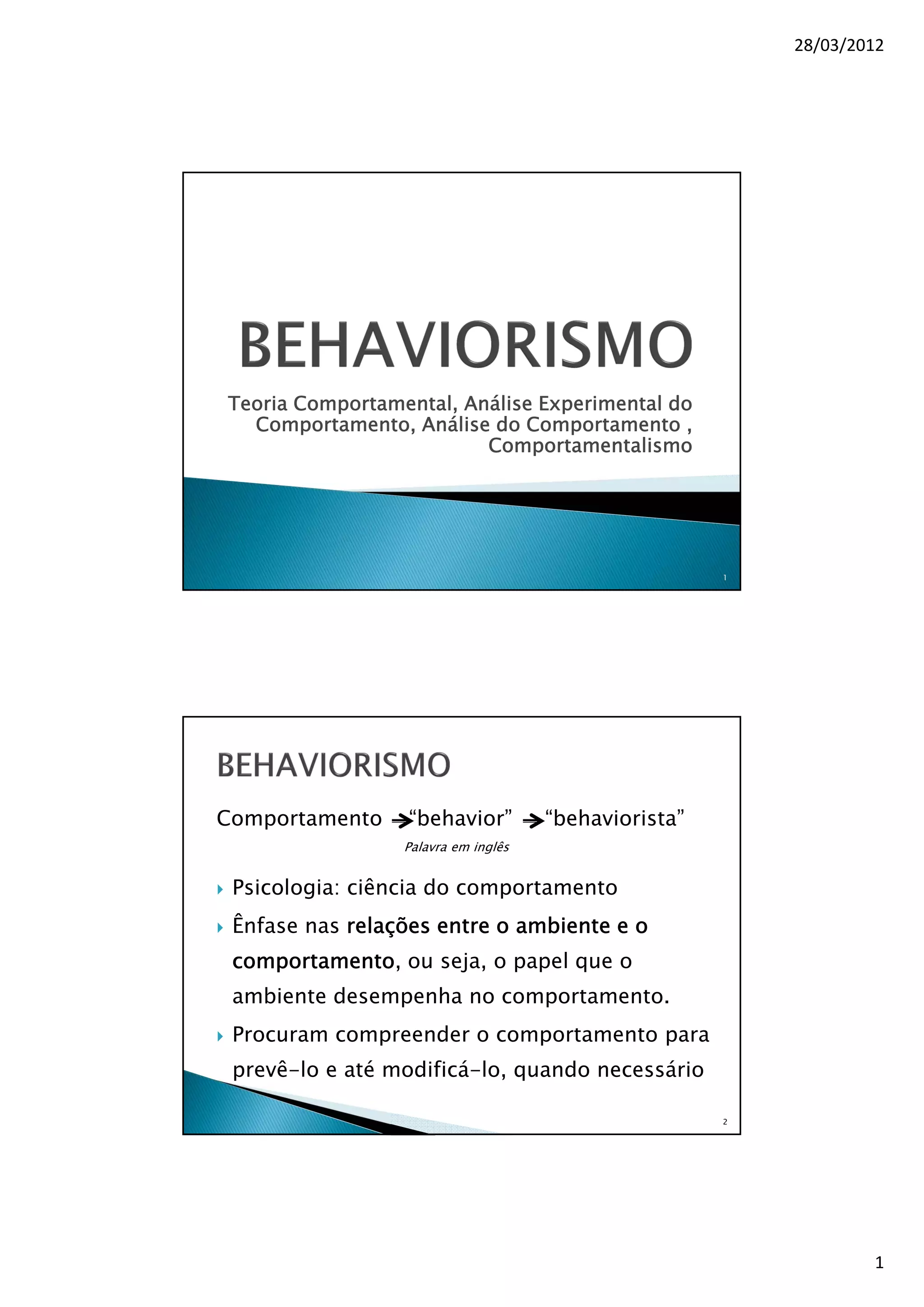 O documento discute os principais conceitos da teoria comportamentalista, incluindo os trabalhos de Watson, Thorndike, Pavlov e Skinner. Aborda temas como condicionamento respondente, condicionamento operante, tipos de reforço e punição.