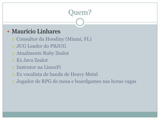 O documento discute Behavior Driven Development (BDD) e automação de testes com RSpec e Cucumber. Ele explica o que é BDD, como ele evoluiu de TDD, e como as ferramentas RSpec e Cucumber permitem escrever especificações e testes de aceitação em linguagem natural.