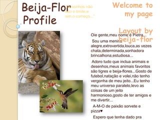 A página de perfil apresenta uma menina chamada Pietra. Ela se descreve como alegre, extrovertida, louca, às vezes chata, determinada e sonhadora. Ela gosta de animais, esportes como futebol e natação, e não tem vergonha de seu jeito único de ser.