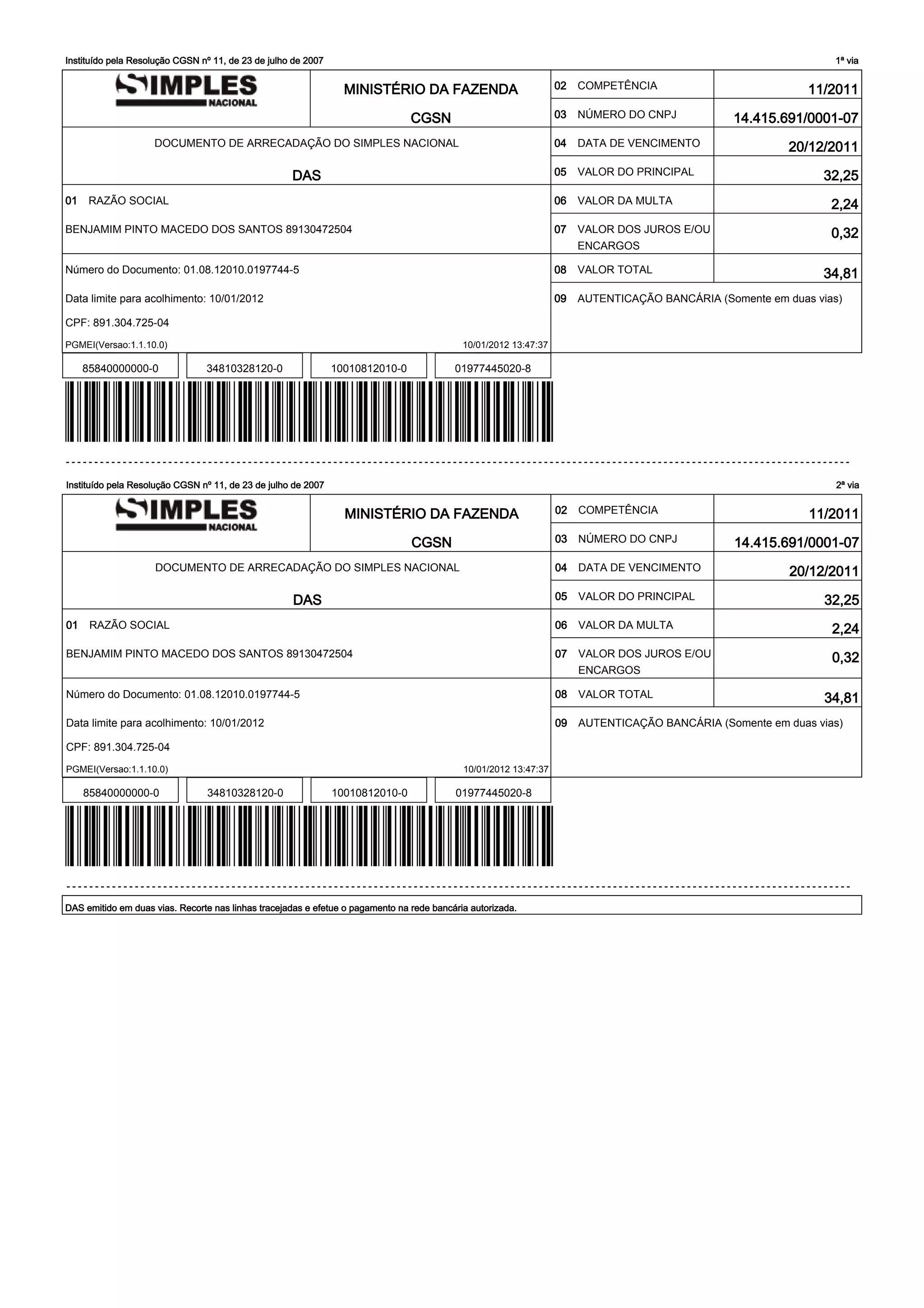 Este documento é um Documento de Arrecadação do Simples Nacional (DAS) emitido em duas vias para Benjamim Pinto Macedo dos Santos. Ele deve pagar R$32,25 referentes à competência de dezembro de 2011 até 20 de janeiro de 2012.