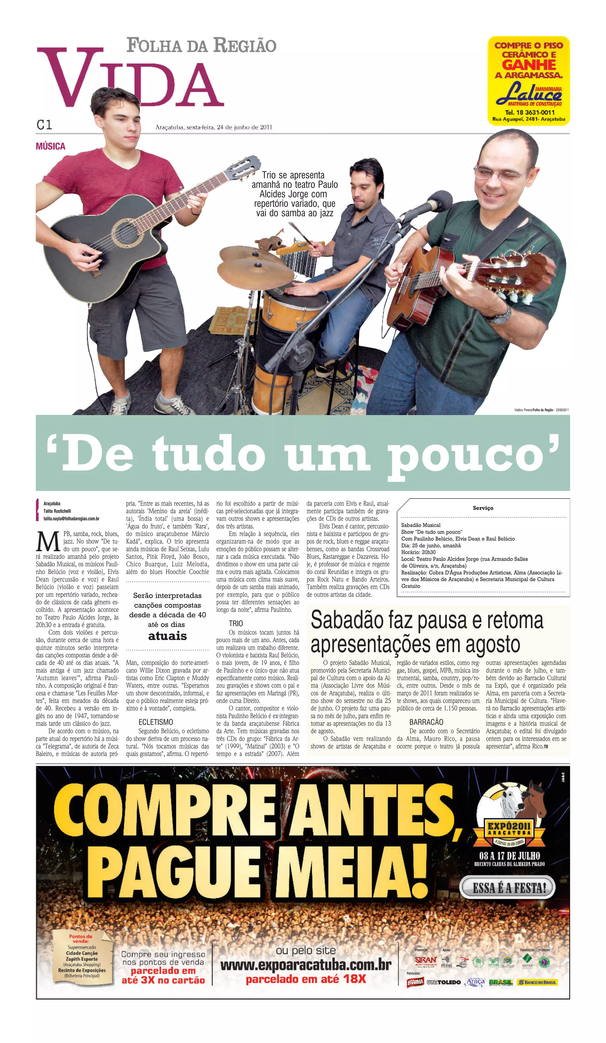 O trio formado por Paulinho Belúcio, Elvis Dean e Raul Belúcio se apresentará amanhã no Teatro Paulo Alcides Jorge com um repertório eclético que passeia por gêneros como samba, rock, blues e jazz. Interpretarão canções desde a década de 1940 até os dias atuais. O show "De tudo um pouco" terá início às 20h30 e a entrada é gratuita.