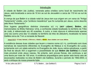 As narrativas do nascimento de Jesus nos Evangelhos de Mateus e Lucas são incompatíveis entre si e com evidências arqueológicas. Evidências apontam Belém da Galiléia, e não Belém da Judéia, como o local mais provável de nascimento. Os autores podem ter colocado o nascimento em Belém da Judéia para ligá-lo ao rei Davi e afirmar que era o lugar profetizado, não Belém da Galiléia.