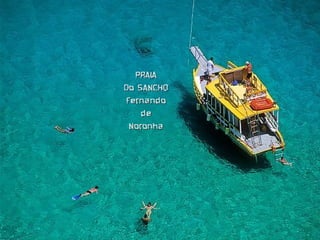 O documento lista vários locais turísticos naturais do Brasil, incluindo praias, cachoeiras, lagos e grutas localizados em diversos estados brasileiros como Fernando de Noronha, Pantanal, Bonito e Jericoacoara. A lista revela a diversidade de belezas naturais encontradas no Brasil.