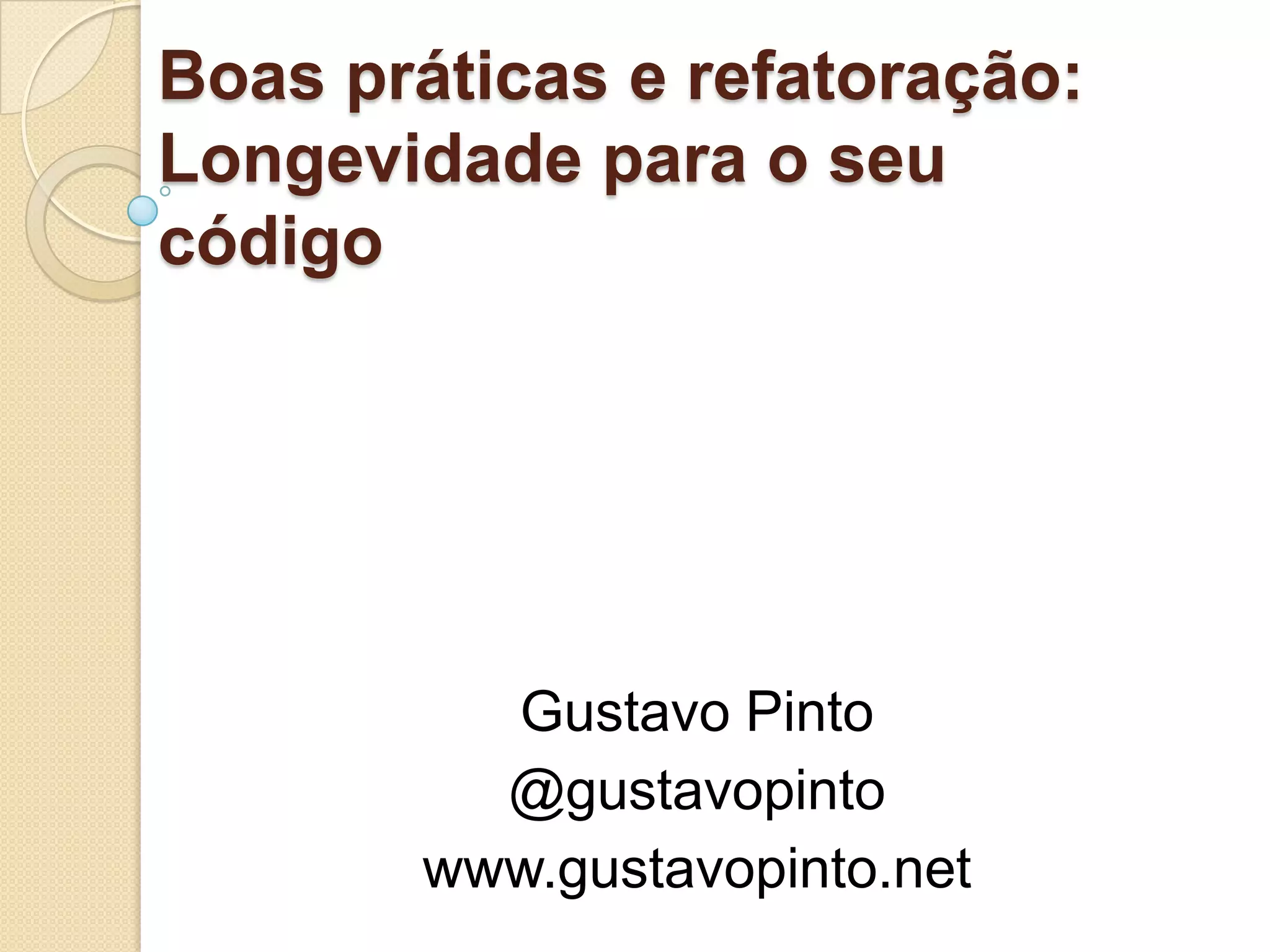 O documento discute boas práticas e refatoração de código, incluindo o uso de interfaces, herança, strings, nomes significativos, métodos pequenos e comentários.