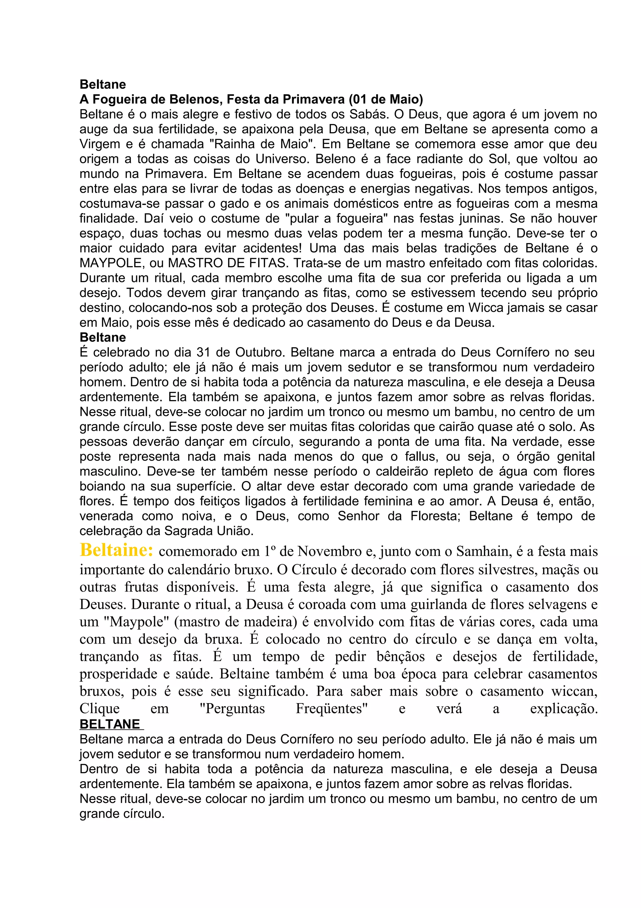 Beltane é uma festa da primavera celebrada em 1o de maio que comemora o amor entre o deus e a deusa da fertilidade. Rituais incluem acender fogueiras para purificação e dançar em volta de um mastro enfeitado com fitas para tecer o próprio destino. É uma época para pedir bênçãos de fertilidade, prosperidade e saúde.