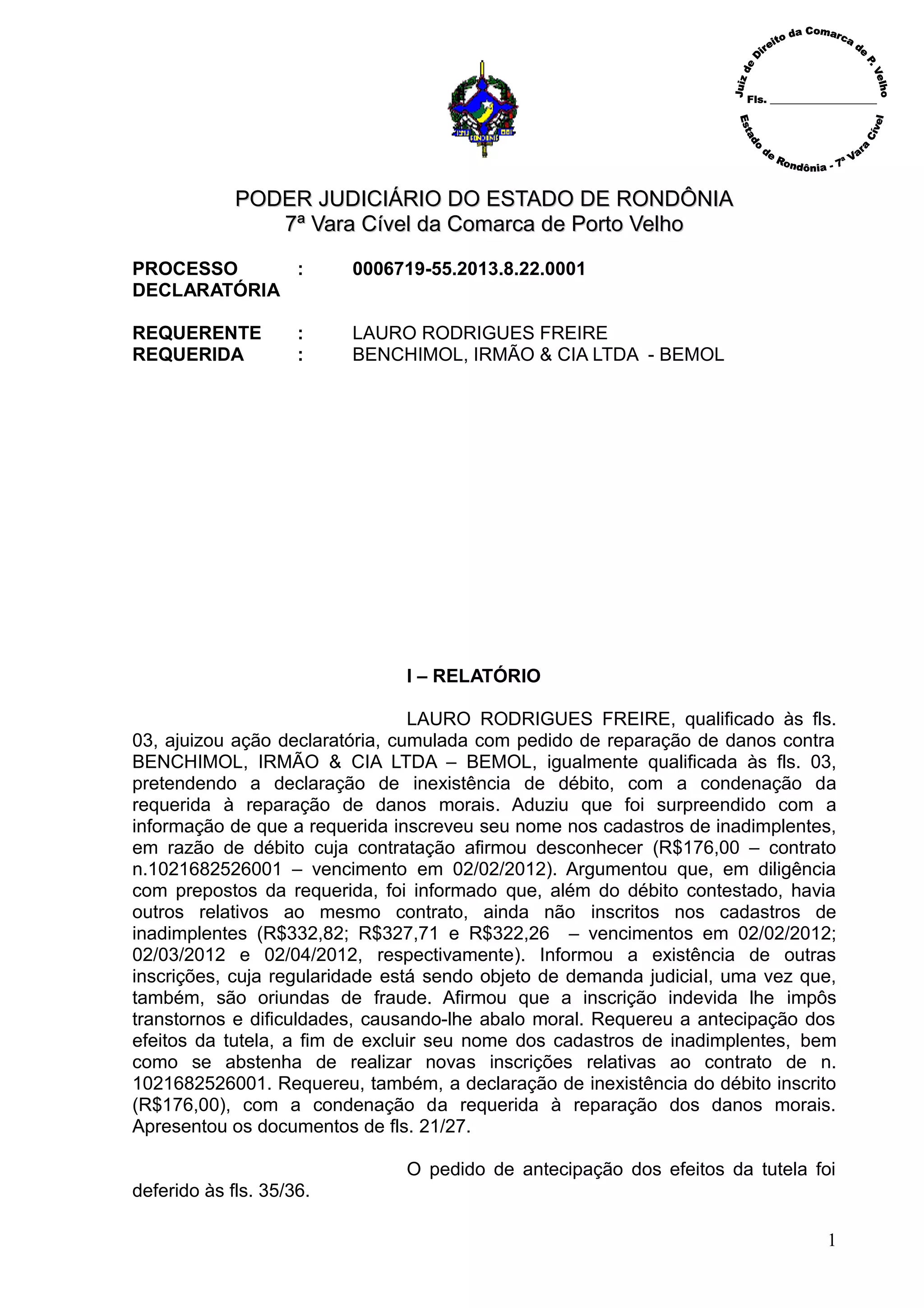 Lauro Rodrigues Freire moveu ação declaratória contra Benchimol, Irmão & Cia Ltda - Bemol para declarar a inexistência de uma dívida no valor de R$176,00 e indenização por danos morais. A requerida não comprovou a existência do débito que originou a inscrição do nome do autor em cadastros de inadimplentes. O juiz julgou procedente o pedido, declarando a inexistência da dívida e condenando a requerida a pagar R$10.860,00 de danos