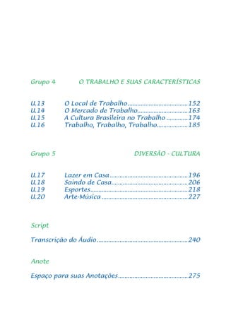 Este documento apresenta um livro didático para ensino de português como língua estrangeira. O livro contém 20 unidades abordando diferentes temas gramaticais e socioculturais do Brasil. Cada unidade traz exercícios, diálogos e textos para ajudar os alunos a aprender gramática, vocabulário e aspectos da cultura brasileira.