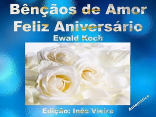 Este poema parabeniza alguém pelo aniversário, desejando que a pessoa tenha muita alegria, saúde e amor. O poema expressa votos de que a pessoa sorria muito, desfrute de abraços carinhosos e tenha um coração cheio de amizade. Ao final, deseja um feliz aniversário.