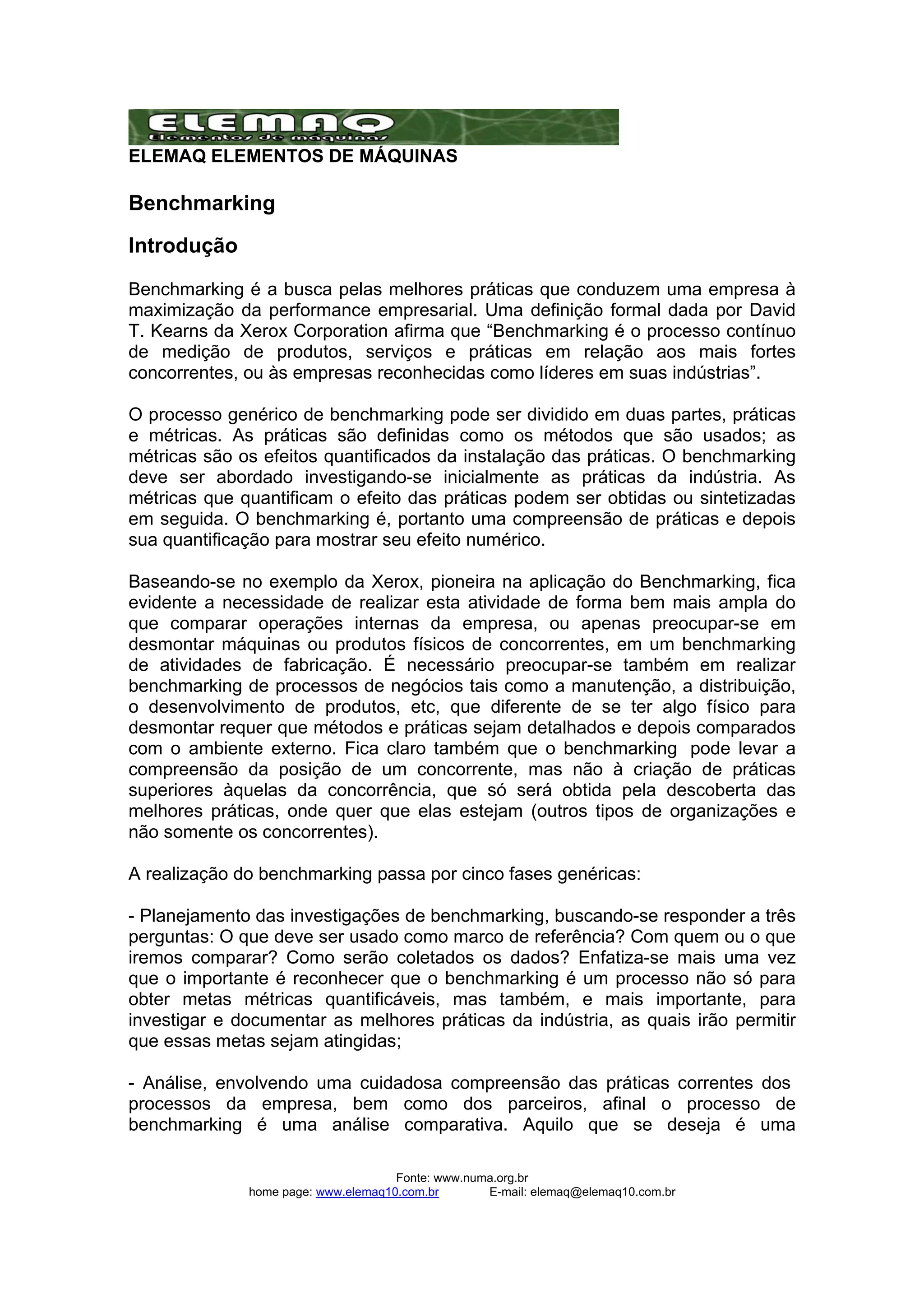 O documento define benchmarking como a busca pelas melhores práticas para maximizar o desempenho empresarial, envolvendo a medição de produtos, serviços e práticas em relação aos concorrentes. Descreve as cinco fases genéricas do processo de benchmarking: planejamento, análise, integração, ação e maturidade. Aponta benefícios como a incorporação de melhores práticas e estímulo à criatividade.