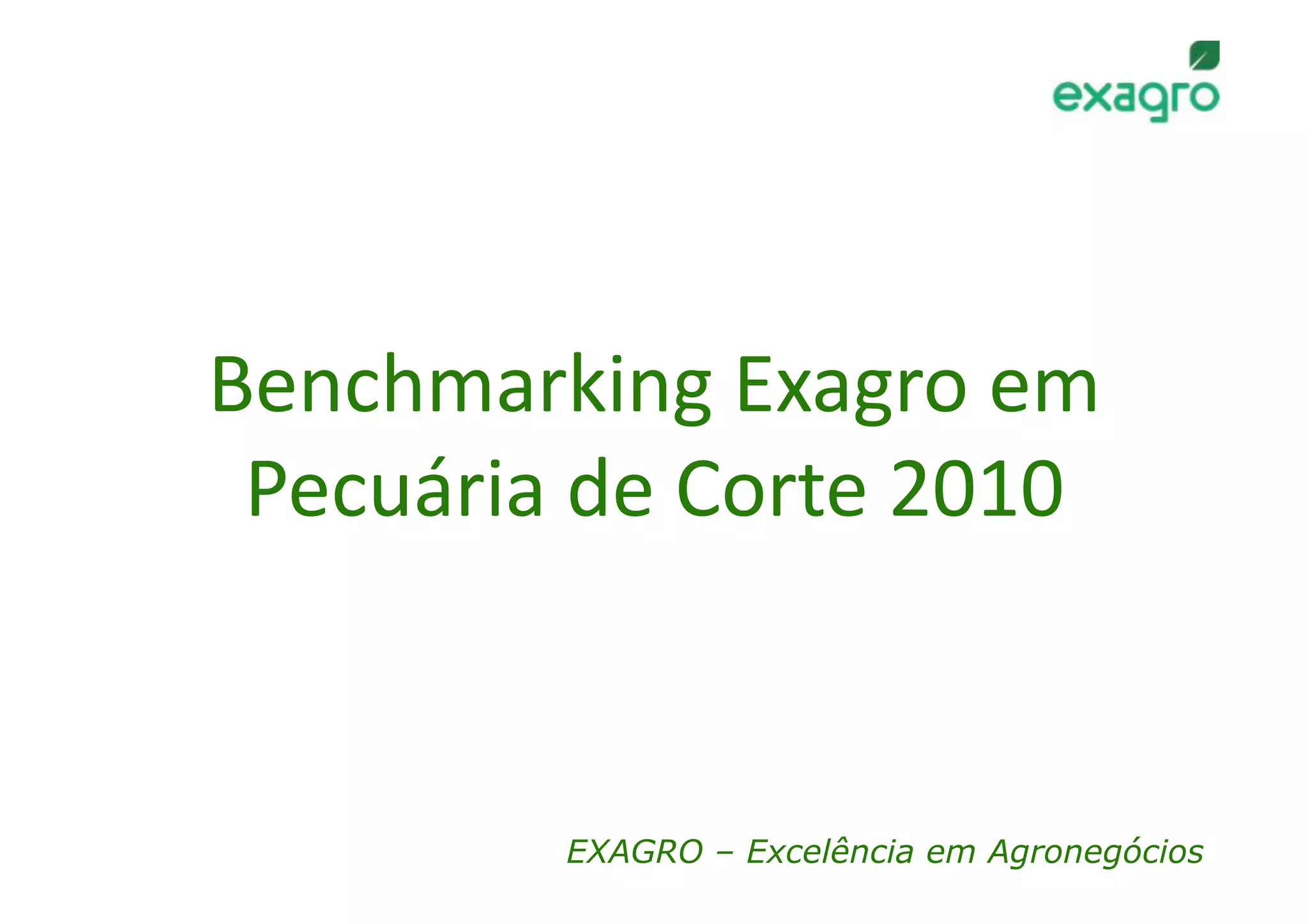 O documento resume os resultados de um benchmarking de propriedades de pecuária de corte realizado pela EXAGRO em 2010. As principais informações são: (1) Foram analisadas 84 propriedades nas regiões Nordeste, Sudeste, Centro-Oeste e Norte do Brasil, (2) Os resultados médios incluem uma produção de 19.375 arrobas de boi e um resultado líquido de R$395.818 por propriedade, (3) Há grande variação nos resultados entre as propriedades, com os melhores sistemas atingindo uma produção