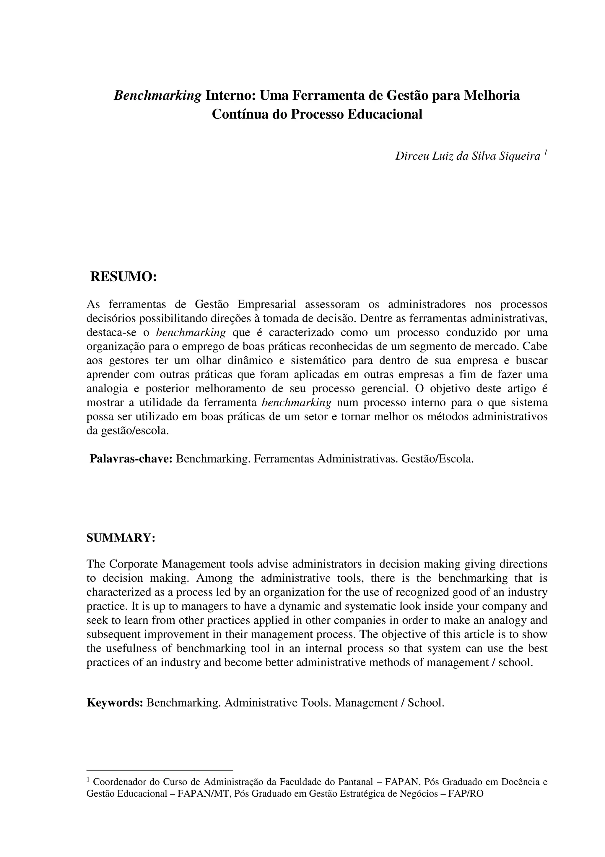1) O documento discute o uso da ferramenta de gestão chamada benchmarking para melhoria contínua nos processos educacionais.