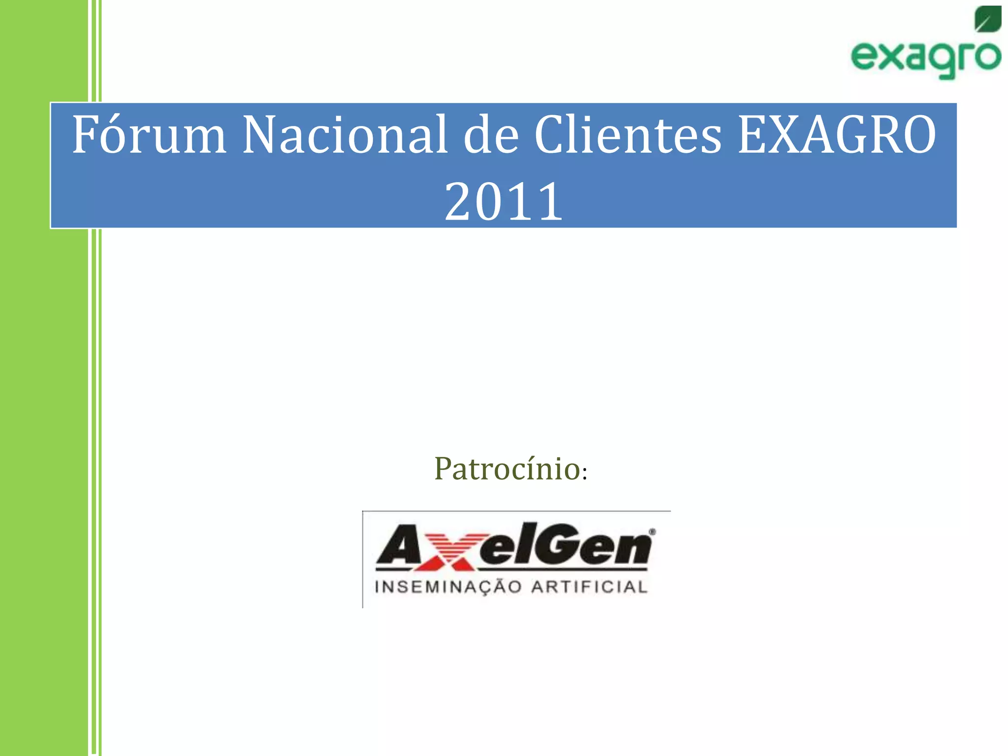 O documento apresenta um resumo do Fórum Nacional de Clientes EXAGRO 2011, que teve como objetivo apresentar métricas de benchmarking para auxiliar produtores rurais a melhorar seus resultados e tomar decisões mais eficientes. O documento discute o que é benchmarking, como ele pode ser usado para identificar oportunidades de melhoria e estabelecer metas, e exemplos de métricas e rankings apresentados no evento.