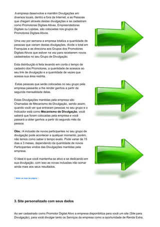 O documento descreve os benefícios oferecidos por uma empresa de marketing multinível para promotores digitais ativos, incluindo participação nos lucros sobre indicações, inclusão de novos participantes no grupo de divulgação, e benefícios adicionais como laptops, planos de saúde e motocicletas ao preencher diferentes níveis no grupo de divulgação.