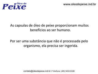 O documento descreve que o óleo de peixe oferece muitos benefícios à saúde, como controlar o colesterol, cuidar do coração e auxiliar no crescimento muscular, e que esses benefícios superam o baixo preço do produto. Ele também fornece contatos para mais informações.