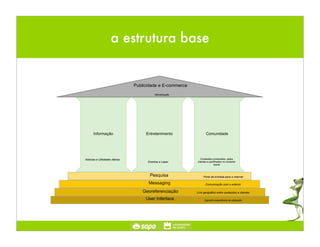 O documento descreve a estratégia da SAPO para se tornar uma plataforma multiplataforma, fornecendo conteúdos e serviços em diferentes dispositivos como computadores, televisões e telefones celulares. A SAPO Mobile leva todo o conteúdo e serviços da SAPO para dispositivos móveis de forma otimizada. A parceria com a Meo oferece conteúdos da SAPO na televisão de forma interativa.