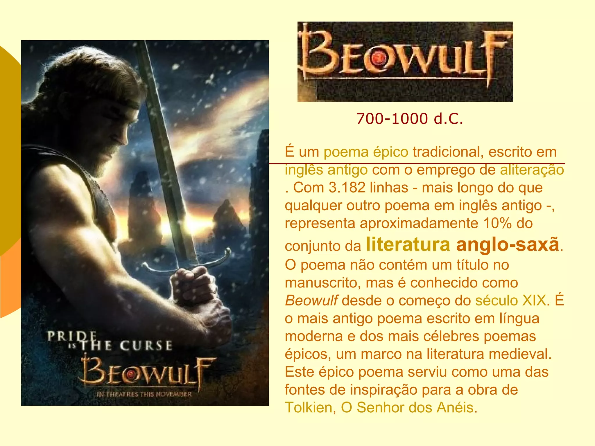 Beowulf é um poema épico em inglês antigo, com 3.182 linhas, que narra as aventuras do herói homônimo em sua luta contra o monstro Grendel e sua mãe, além de enfrentar um dragão em sua velhice. É considerado um marco da literatura medieval e uma das fontes de inspiração para J.R.R. Tolkien. O poema destaca a busca de Beowulf por fama e sua luta pela proteção de seu povo.