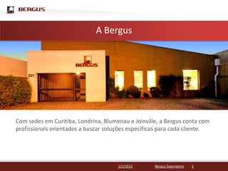 A Bergus é uma corretora de seguros com mais de 24 anos de experiência que oferece soluções personalizadas para mais de 10.000 clientes nas regiões Sul e Sudeste do Brasil. A empresa tem escritórios em 4 cidades e uma equipe especializada que desenvolve planos de seguro sob medida para cada cliente, considerando seus riscos e necessidades específicas.