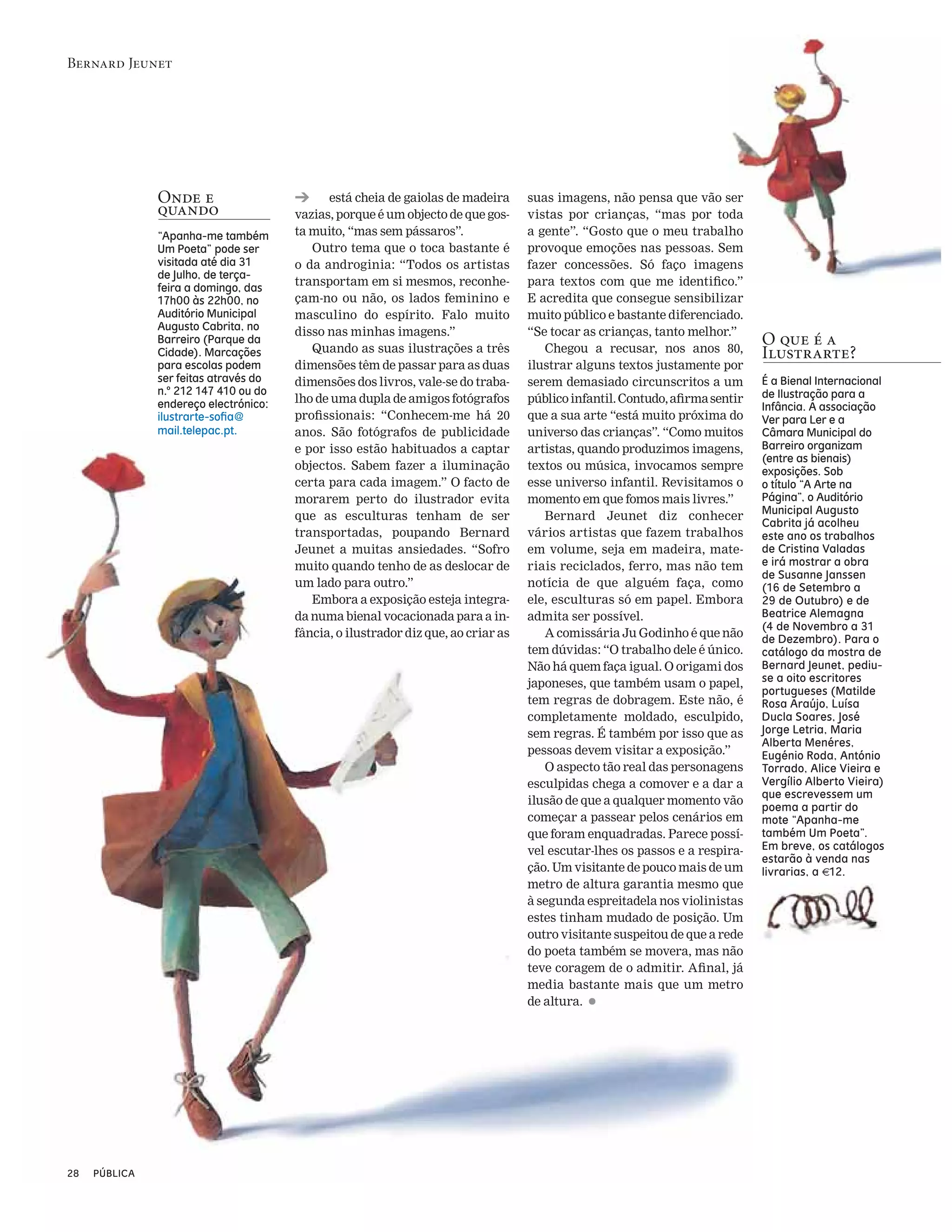O documento descreve a exposição de Bernard Jeunet no Auditório Municipal Augusto Cabrita no Barreiro. A exposição apresenta esculturas de papel feitas pelo artista, retratando temas como androginia. Embora destinada a público infantil, o artista acredita que a sua arte também toca adultos. A comissária da mostra elogia o trabalho único de Jeunet, que esculpe o papel sem regras.