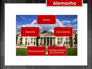 O documento fornece informações sobre a Alemanha, incluindo sua história, monumentos famosos como o Muro de Berlim e a Torre Vermelha, feriados oficiais e férias escolares.