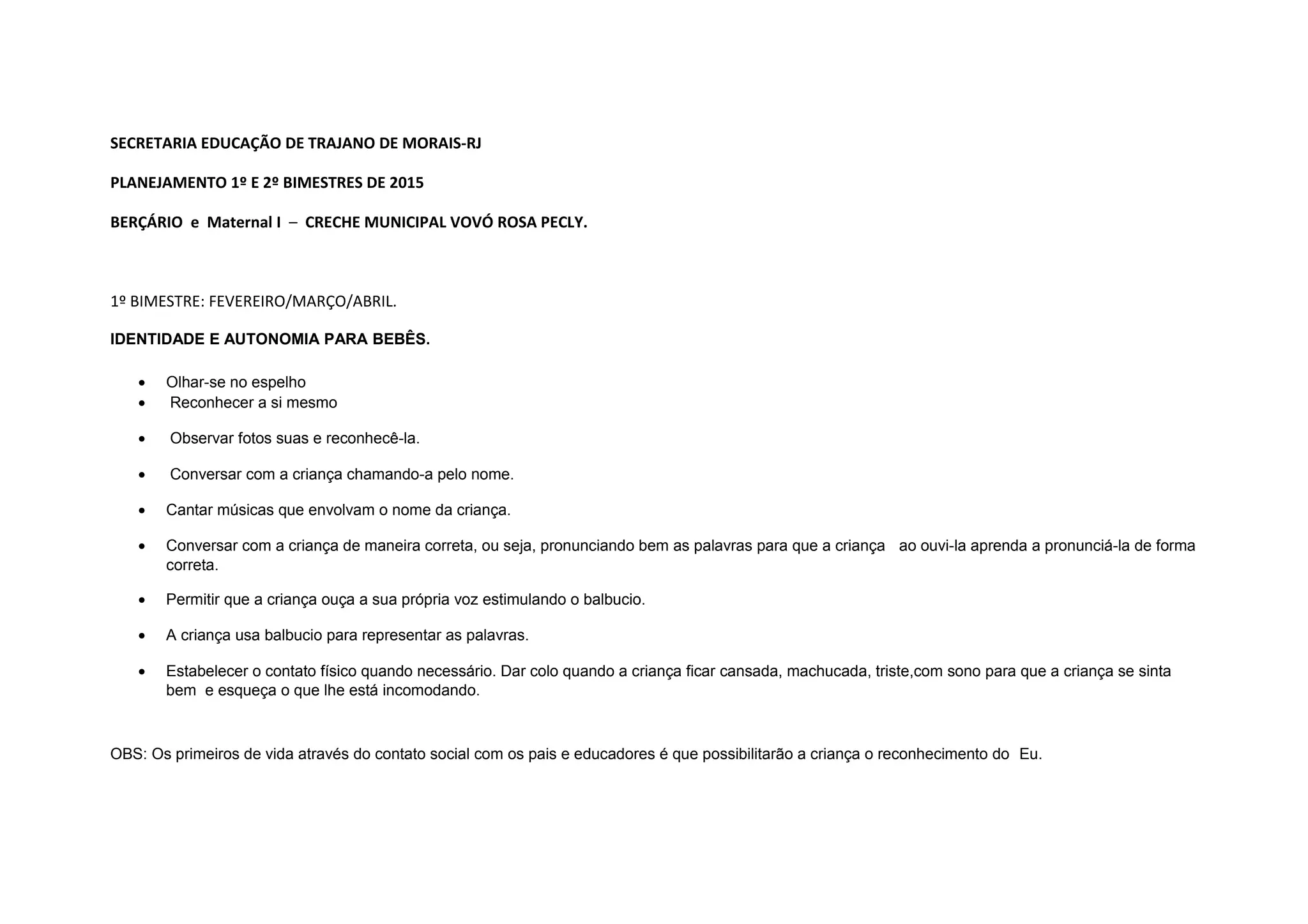 O documento descreve o planejamento para os primeiros e segundos bimestres de 2015 para a creche municipal Vovó Rosa Peckly. No primeiro bimestre, as atividades se concentrarão em estimular a identidade e autonomia das crianças, incluindo reconhecimento de si mesmas no espelho. No segundo bimestre, as atividades se concentrarão no desenvolvimento da linguagem oral e estimulação musical, visomotora e motora das crianças.