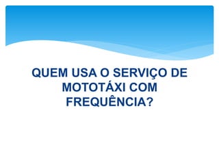 O documento discute um serviço de mototáxi chamado MotoLegal que funciona através de geolocalização em um aplicativo móvel, conectando usuários a mototaxistas próximos. O serviço é organizado por uma empresa terceirizada que criou o aplicativo web para agilizar a prestação do serviço e expandir o negócio para toda a região.
