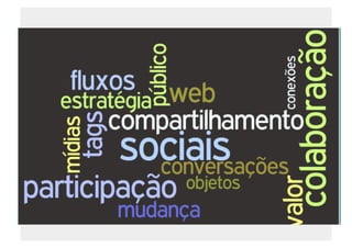 O documento discute as estratégias de comunicação corporativa em mídias sociais. Ele define mídias sociais, explica como as mídias sociais mudaram a comunicação de um modelo de um para muitos para muitos para muitos, e fornece diretrizes sobre como as empresas podem usar ferramentas de mídias sociais, gerenciá-las e medir seu valor.