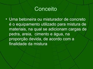 O documento descreve os tipos, classificação, sistemas de mistura e fatores que influenciam a qualidade da mistura em betoneiras. Betoneiras podem ser móveis, fixas ou semi-fixas e são classificadas pelo método de descarga. Fatores como tempo e ordem de mistura, manutenção e transporte afetam a uniformidade e qualidade do concreto produzido.