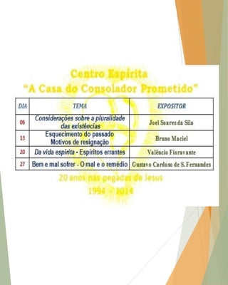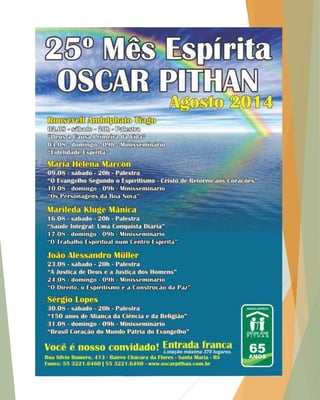O documento resume a história do Espiritismo no Brasil desde os primeiros experimentadores da mediunidade na década de 1840 até a atualidade. Destaca personagens importantes como Bezerra de Menezes e Chico Xavier e instituições como a Federação Espírita Brasileira fundada em 1884. Também discute temas como mediunidade, obsessão e programação de eventos de casas espíritas.