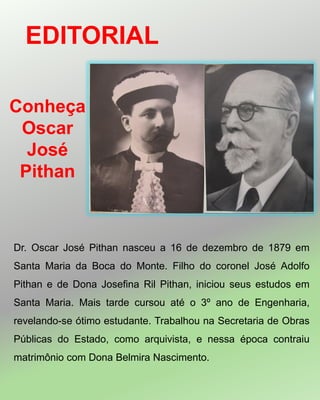O documento apresenta um resumo biográfico de Oscar José Pithan, médico e espírita brasileiro nascido em 1879. Ele se destacou como estudante exemplar, professor universitário e fundador do Hospital Espírita de Porto Alegre em 1912.